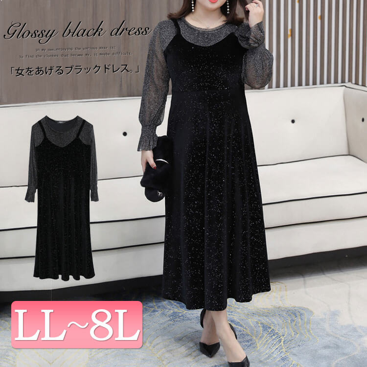 l大きいサイズ レディース ワンピース フェイクレイヤード チュールインナー シースルー シアー キャミワンピ キャミソールワンピース ベロア キラキラ ラメ ドレス お呼ばれ パーティー ブラック 黒 長袖 膝下丈 秋新作 体型カバー LL 3L 4L 5L 6L 7L 8L 韓国ファッション
