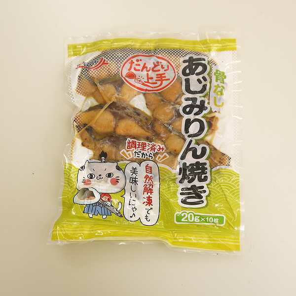 ■名称:あじのみりん焼き(骨なし) ■内容量:200g(10枚入り) ■原材料名:あじ、砂糖、みりん、しょうゆ、食塩、水あめ、でん粉、大豆油/調味料(アミノ酸等)、着色料(クチナシ、紅麹)、(一部に小麦・大豆を含む) ■保存方法:【要冷凍】-18℃以下で保存してください※ 解凍(開封)後はお早めにお召し上がり下さい。